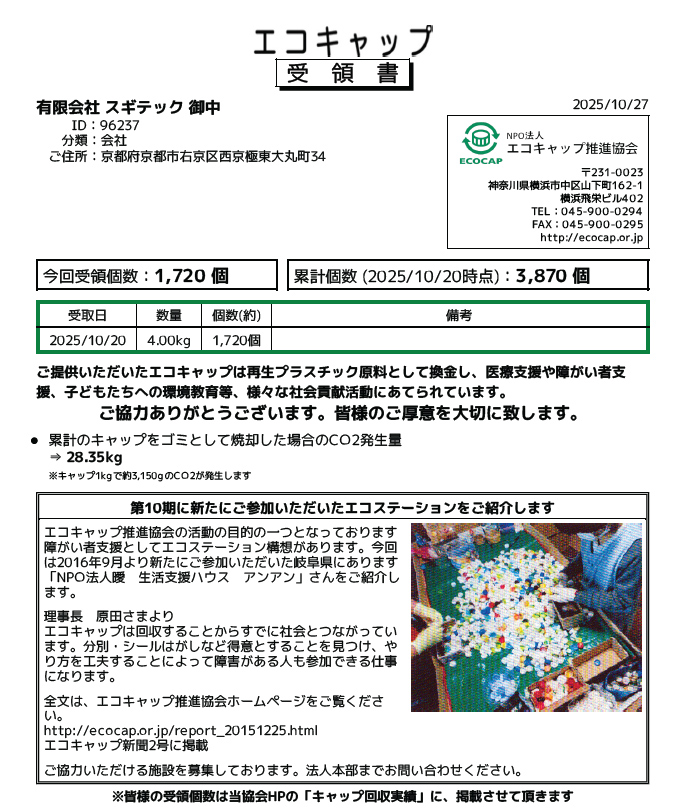 このたび、昨年の6月から約1年3ヶ月分集めたペットボトルキャップを、NPO法人エコキャップ推進協会へ送付させていただきました。